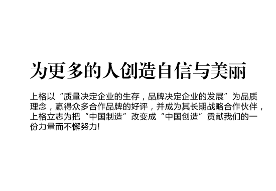 上格一路走來(lái),以“締造時(shí)尚集團(tuán),使公司受人尊敬,令人向往;為客戶提升價(jià)值,創(chuàng)造成功;讓員工提高生活品質(zhì),實(shí)現(xiàn)自我價(jià)值”作為我們的目標(biāo),“為更多的創(chuàng)造自信與美麗” 作為我們的使命,立志為把“中國(guó)制造” 改變成“中國(guó)創(chuàng)造”貢獻(xiàn)我們的一份力量而不懈努力!